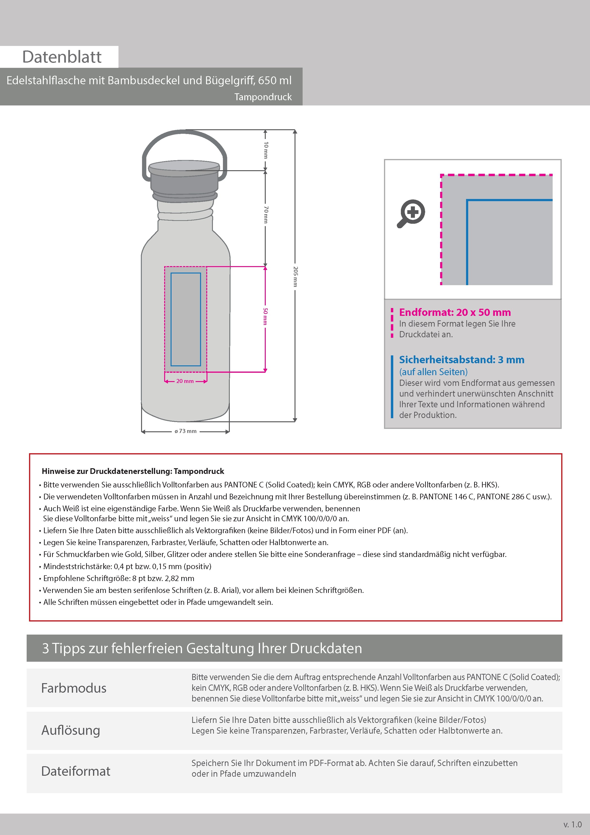 Edelstahlflasche mit Bambusdeckel und Bügelgriff 650 ml, 1-farbig, einseitig bedruckt